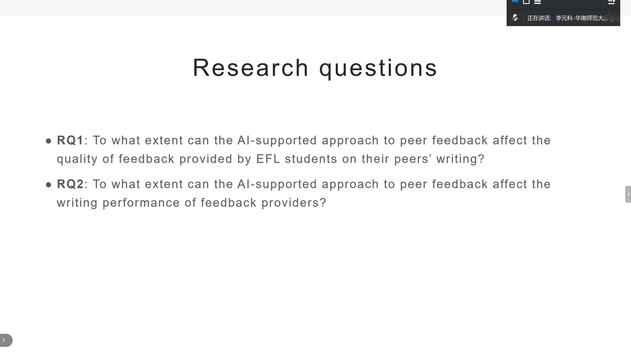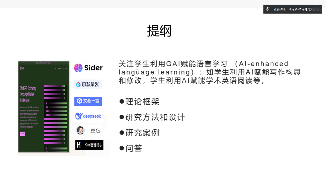 讲座伊始,李元科教授提出,教育行业的“智能化”转型如火如荼,外语教育工作者也应顺势而为。他首先介绍了学生利用GAI赋能语言学习(AI-enhanced language learning)相关研究的理论框架(社会文化理论、社会认知理论、认知理论和设计导向理论),并结合实证研究详细介绍了量化、质性与混合方法的研究范式,以及“被试间设计”和“被试内设计”等研究设计类型。最后,他还分享了研究团队关于学生如何利用AI赋能写作构思和修改以及开展学术英语阅读等方面的研究成果。