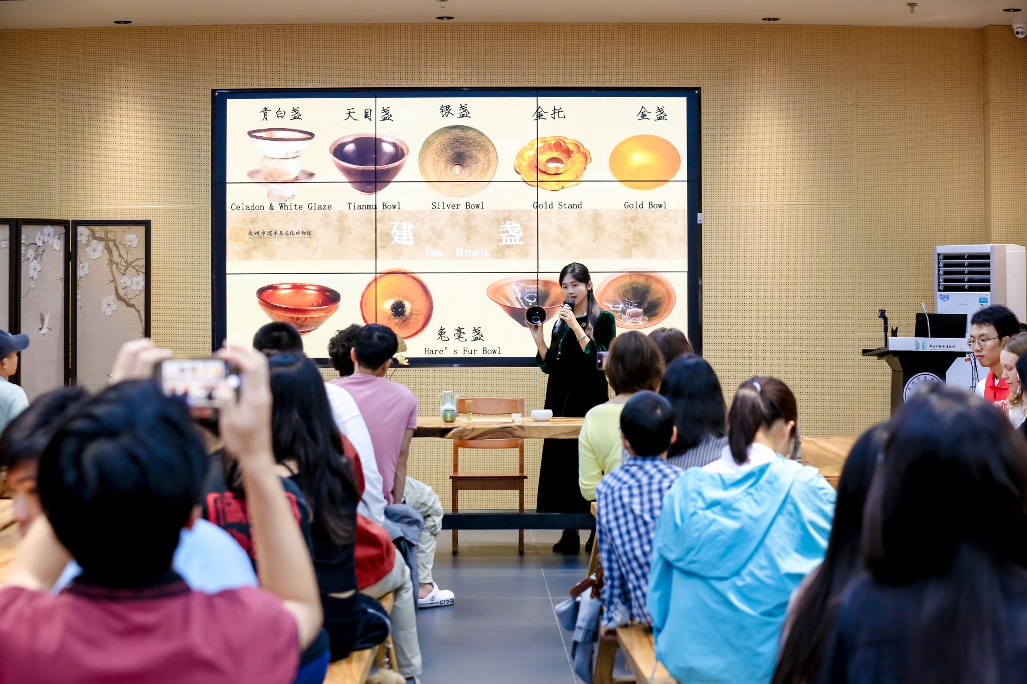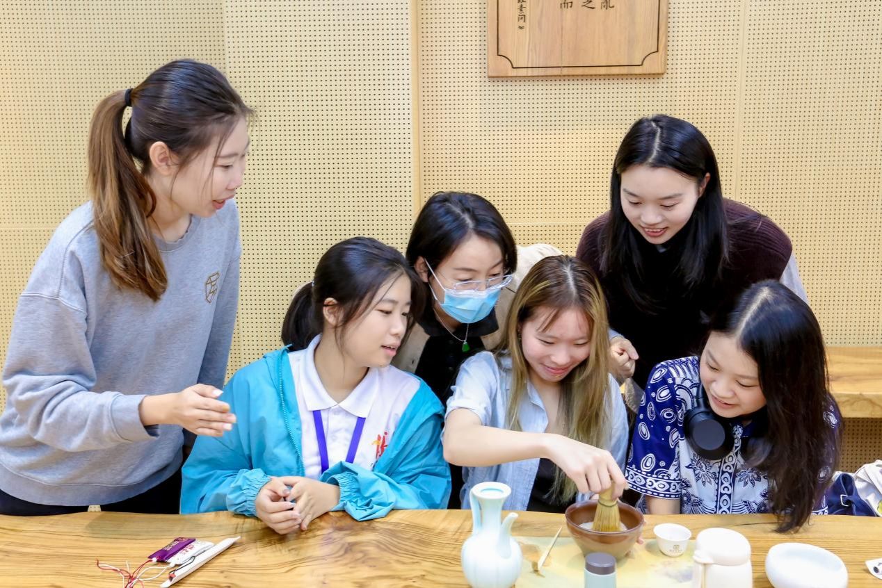 在“宋代点茶”体验中,国家二级茶艺师蔡晓怡带领学生们亲身体验“七汤点茶”与“茶百戏”的古老技艺。