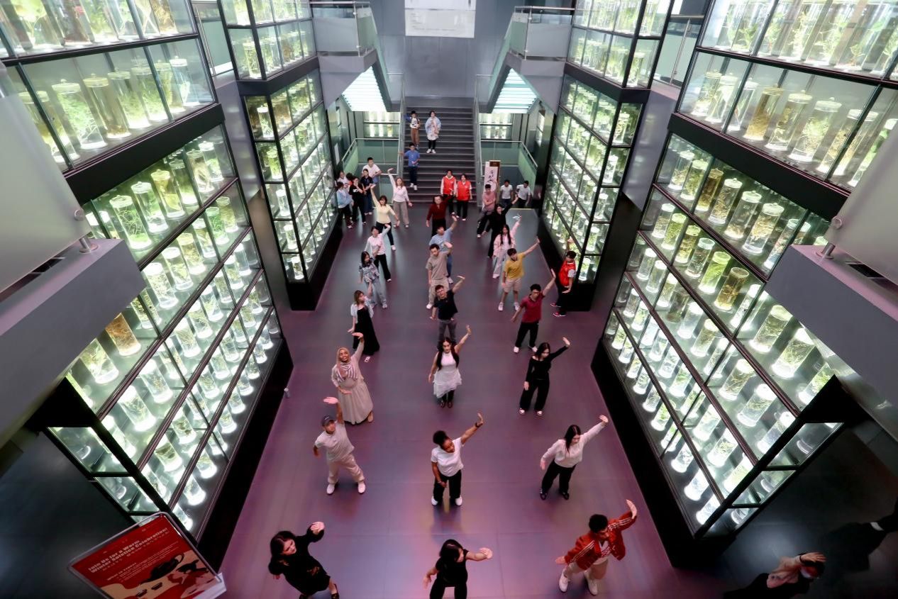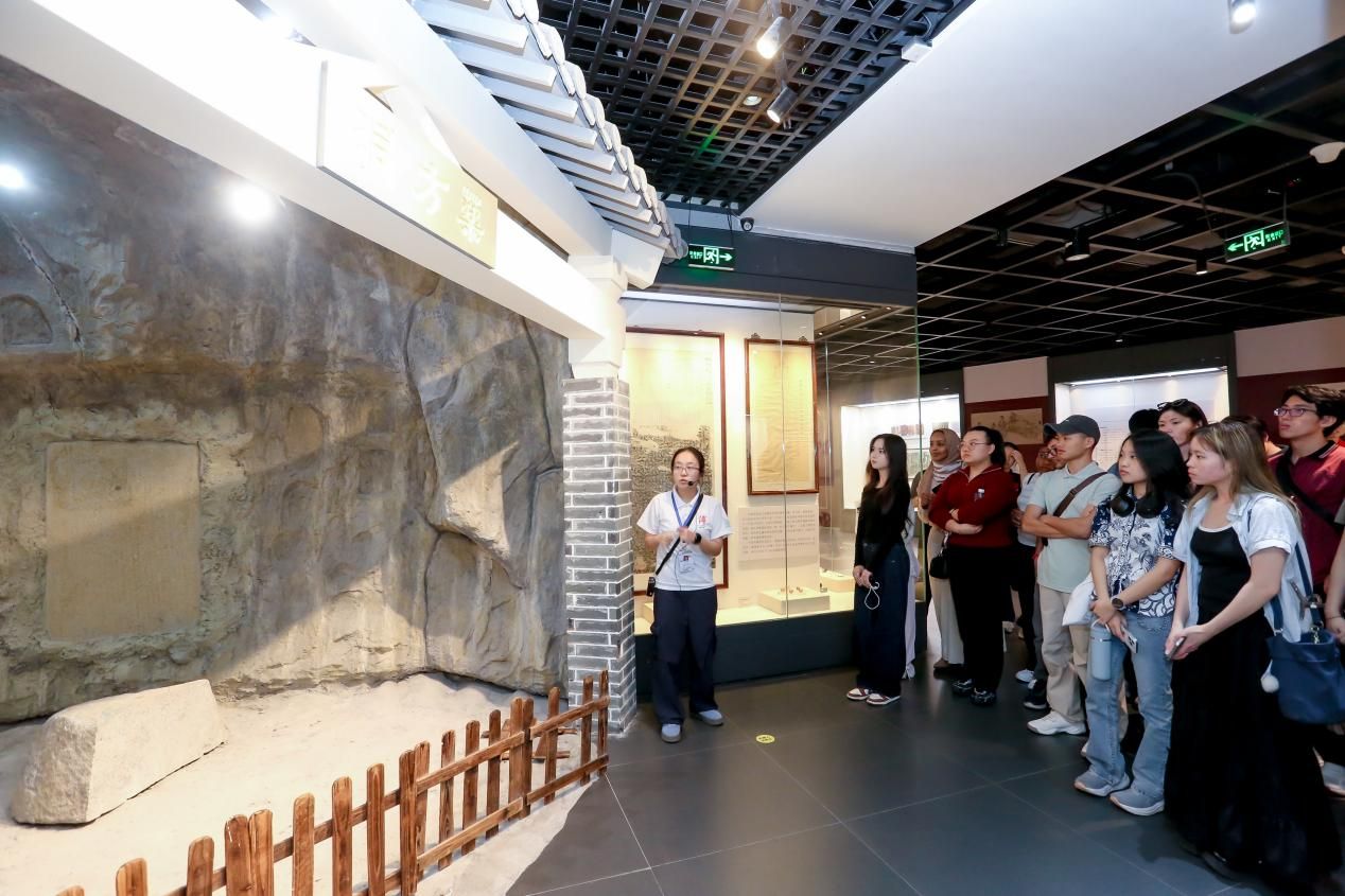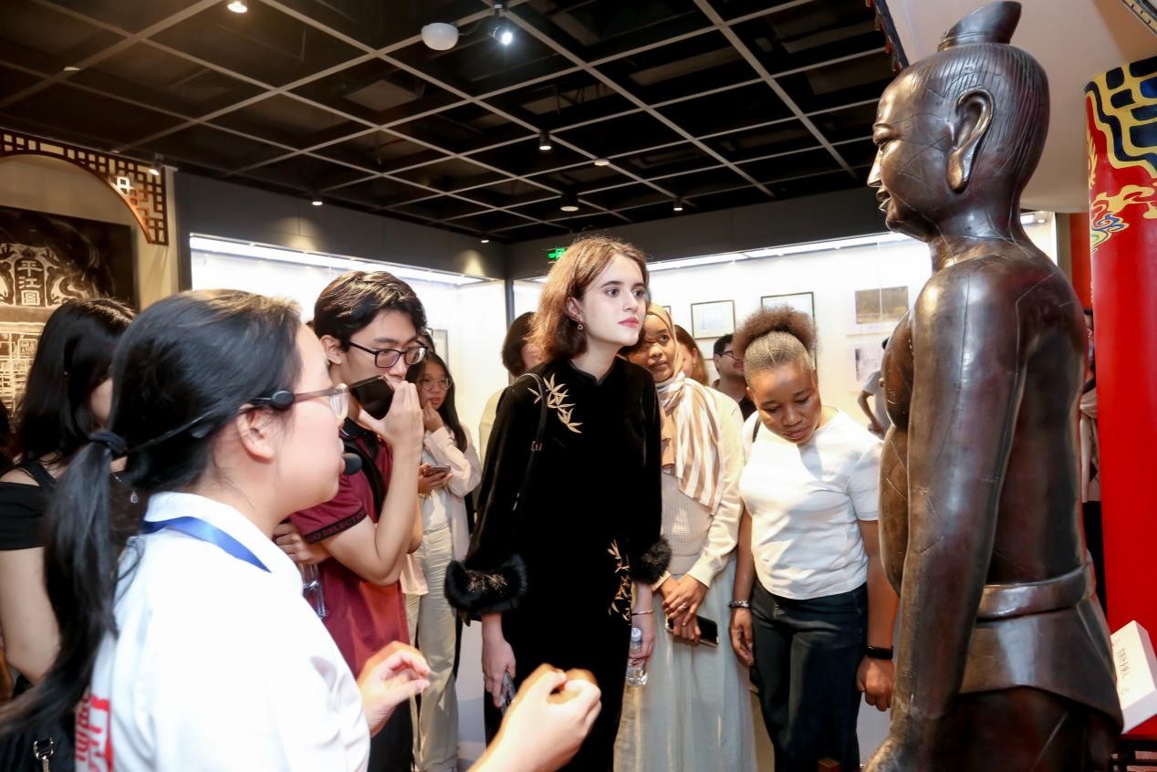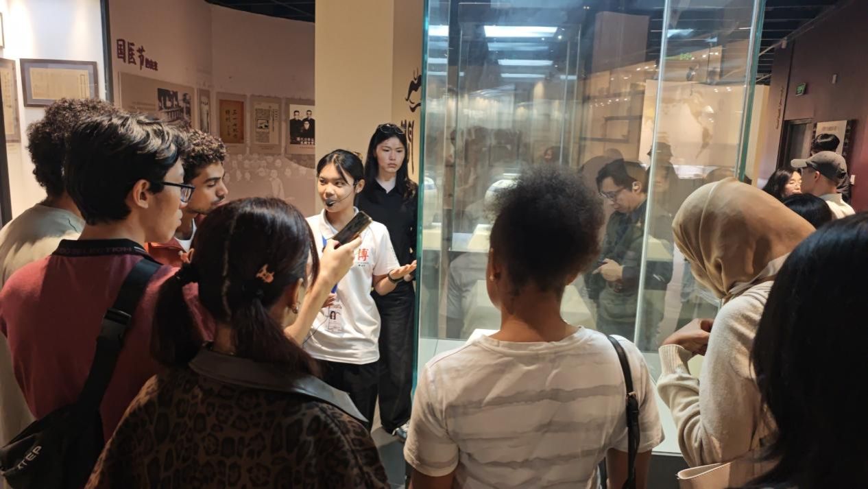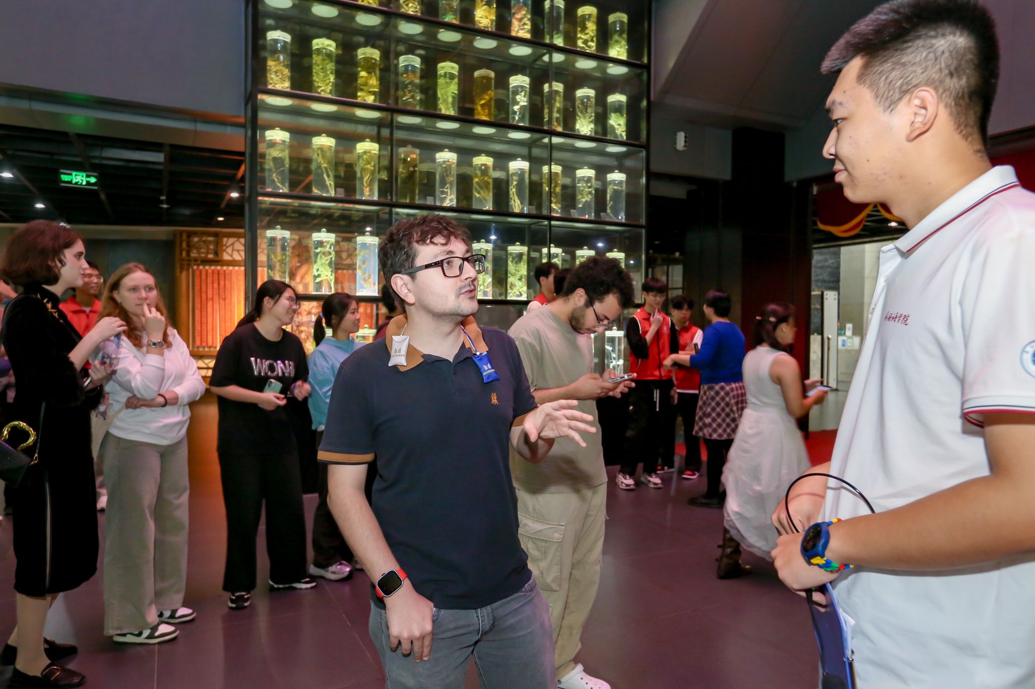 随后,在外国语学院四位英文讲解员的引导下,国际学生参观了广东中医药博物馆的中药液浸植物标本展区(俗称“中药水晶宫”)与医史馆。讲解员用深入浅出的语言,对馆内珍藏的人参标本、中医药始祖像、四大经典医籍、针灸铜人模型以及广彩描金十二生肖图瓷药瓶等展品进行了生动的解说,使国际学生对中国医药学的历史源流与发展脉络有了更为直观和深刻的理解。